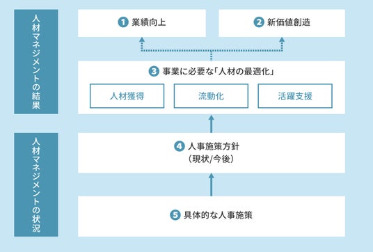 各要素の関係性を分析することで、企業がどのような4.人事施策方針や5.具体的な人事施策を取れば、3.人材の最適化が進むのかを明らかにしました。あわせて、3.人材の最適化は、1.業績向上や2.新価値創造とどのように関係しているかを確認しました。