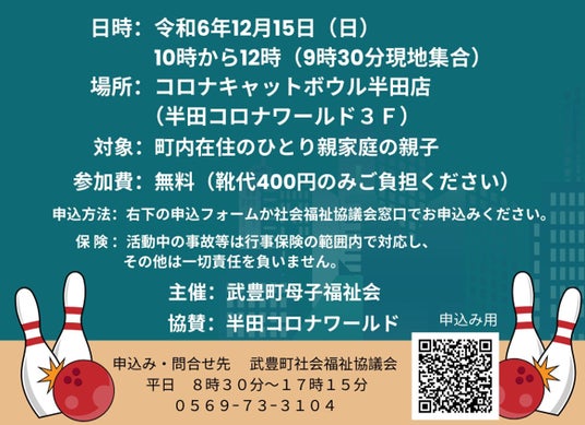 株式会社コロナワールド (本社:愛知県小牧市、代表取締役社長:室橋 義隆) が運営する「コロナキャットボウル 半田店(ボウリング場)」は、2024年12月15日(日)に 武豊町母子福祉会主催のもと、武豊町在住のひとり親家庭の親子をボウリングに無料招待する「親子ふれあいボウリング大会」を開催いたします。