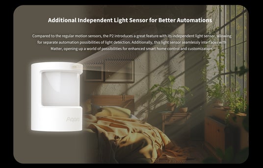 一般の人感センサーと比較して、人感センサーP2には独立した光センサーが組み込まれています。Matterにも対応した光センサーはモーションセンサーと独立して、様々な自動化シーンで利用できます。これにより、照度が200ルクス以下になった場合のみ照明をつけるなど、カーテンや照明の自動化をより柔軟に設定できます。