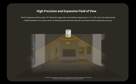 人感センサーP2は、水平方向に最大170°、垂直方向に45°の広い検知角を持ち、最大7メートル(発売予定のM3ハブと組み合わせて使用する場合、10メートルまで延長可能)の検知範囲をカバーできます。さらに、精密なハードウェアのおかげで、人感センサーP2は微細な動きさえも検出できます。