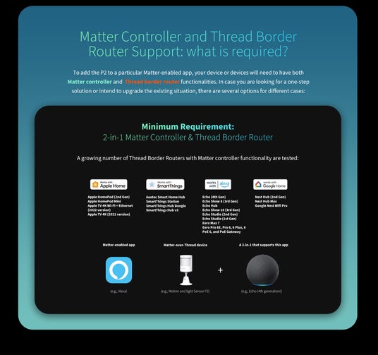 スマートホーム統一規格MatterにThread経由で対応しているので、ユーザーは異なるエコシステムと通信方式間の互換性を心配する必要性がなく、最小限でMatterアプリ、ThreadボダールーターとMatterコントローラーの2 in 1Matterハブさえあれば、どのエコシステムでも人感センサーP2を利用できます。