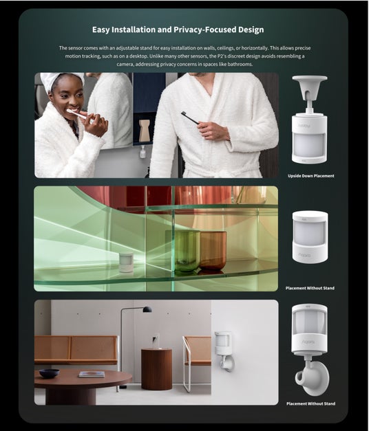 人感センサーP2には360度調整可能なスタンドが付属でついており、壁、天井、または水平に簡単に取り付けられ、特定エリアだけを検知するように角度を簡単に調整することもできます。また、人感センサーP2はカメラのような見た目で利用者に負担をかけることを避けるようにデザインされ、浴室などのプライベートな場所でも安心して使えます。
