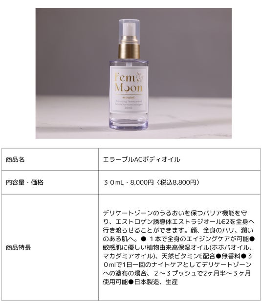 そんな世界を目指めす女性ホルモン博士として活躍中の代表本庄楓が務める株式会社E’rableの商品リリース第一弾は女性の不調、エイジングサインの引金となっている女性ホルモンの減少、低下を補う女性ホルモン(エストロゲン)配合化粧品FemMonn(フェムムーン)の先行販売を開始します。