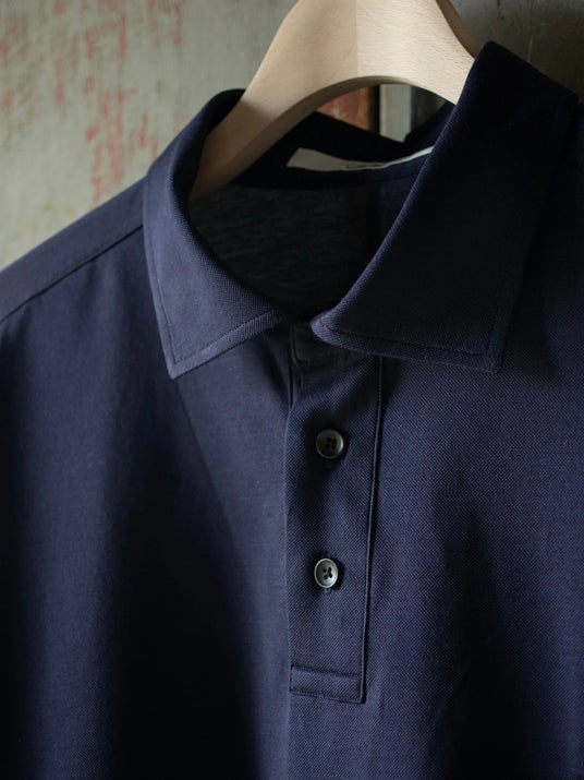 落ちた肩と長い袖が特徴のポロシャツです。素材はイタリアのアルビニ社で紡績されたスーピマコットンを使用し、日本国内で染色・編み立てされた高品質な鹿子生地です。さらさらとした触感と柔らかな光沢が高級感を醸し出します。左胸にはTOKIARIのロゴがさりげなく刺繍され、光を受けて浮き上がるデザインになっています。カジュアルなスポーツアイテムにエレガントさと知性を融合させた夏のリゾートシャツです。