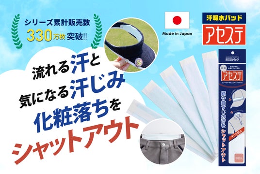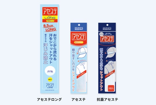 帽子、サンバイザー、ヘルメットに貼るだけでおでこから流れ落ちる汗をしっかり吸収してくれる使い捨て汗取りパッド「アセステ」。「抗菌アセステ 5枚入り」を新たなラインナップとして発売開始します。