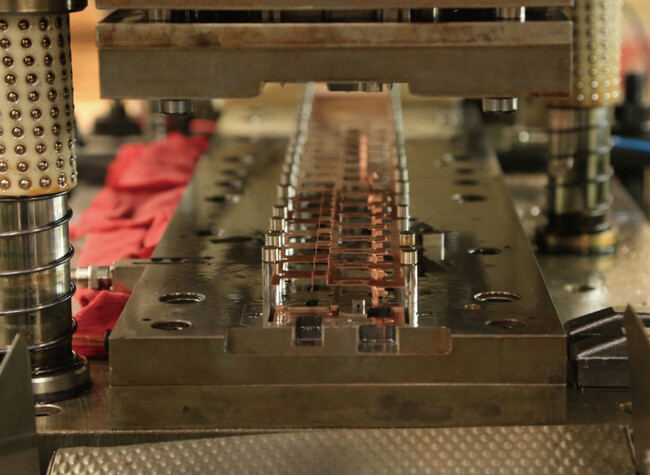 トミテックが得意とするのは「区内で型が作れるのはうちだけではないか」と代表取締役・尾頭美恵子氏が語る「自動順送プレス」と呼ばれる金型の設計・製作と、その「自動順送プレス」金型を使った精密薄板バネの製作。