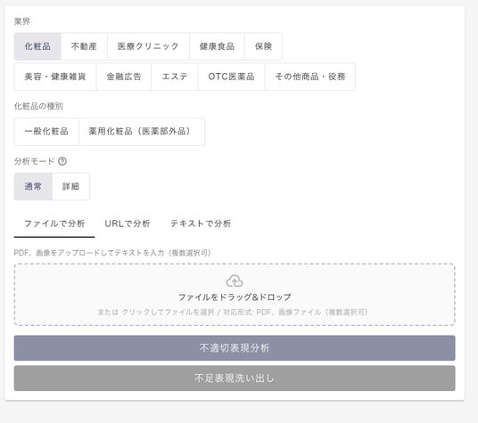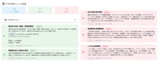 また、化粧品においても、一般化粧品/薬用化粧品(医薬部外品)の区分に応じて確認観点を切り替えられるため、商材の特性に合わせた、より適切な分析を行うことができます。