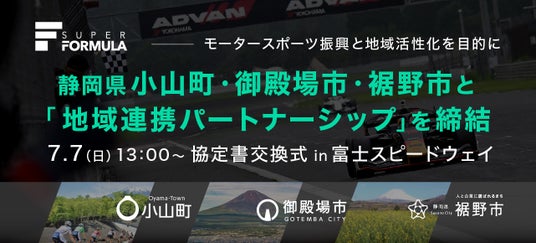 日本レースプロモーションは、7月に「第1回瑶子女王杯 全日本スーパーフォーミュラ選手権 第4戦富士大会」が開催される富士スピードウェイを中心に2市1町と地域連携パートナーシップを締結しました。