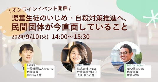 当日はOVA代表理事である伊藤次郎の他、一般社団法人RAMPS(ランプス)代表理事の北川裕子様、株式会社マモル代表取締役CEOのくまゆうこ様が登壇します。児童生徒のいじめ・自殺対策にご関心のある方、教育関係者の方はぜひご参加ください。