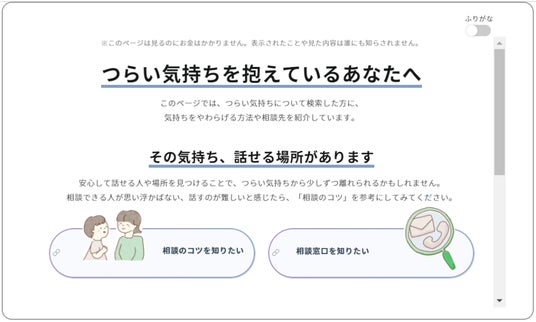 こうした状況を受け、NPO法人OVAでは、2024年7月に学校で提供される1人1台端末向けのブラウザ拡張機能「SOSフィルター」の無償提供を開始しました。SOSフィルターは、児童生徒が1人1台端末であらかじめ登録された深刻な悩みに関するワードを検索した際、相談窓口やセルフケアの方法をまとめた情報をプッシュ型で届けることができます。
