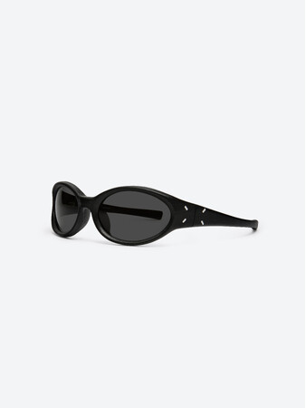 ボリュームのあるラップアラウンドシェイプと、シンプルなブラックレザー素材、テンプルの側面にある4つのホワイトステッチはメゾン・マルジェラのアイコニックなアイデンティティを象徴している。