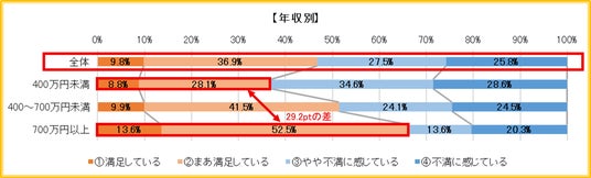 年収別にみると年収が上がるにつれて満足の割合は増加し、「不満」は減少する傾向が見られた。特に、年収400万円未満と700万円以上では満足の割合に29.2ptの差がついた。一方で、年収700万円以上でも33.9%が「不満」と回答しており、約3人に1人は会社の待遇に満足していないことがうかがえる結果となった。