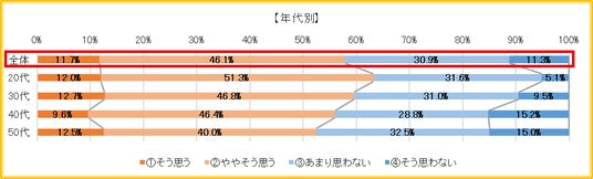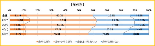 年代別にみると、20代(63.2%)・30代(65.1%)はともに「思う」が6割超だが、40代(59.2%)、50代(53.3%)は徐々に減少していく傾向が見られた。