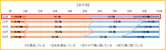 全体では満足(1.満足+2.まあ満足)が53.0%、不満(3.やや不満+4.不満)が46.9%と、拮抗する結果となった。