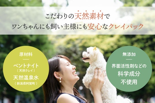 当社はこれまで、ペット用トイレ砂などに使用される天然粘土の製造を手掛けてきました。このノウハウを活かし、「愛犬の肌トラブルと匂いの根源をなくしたい」という思いから、天然クレイと温泉水を主成分とした無添加のペット用クレイパックを開発しました。
