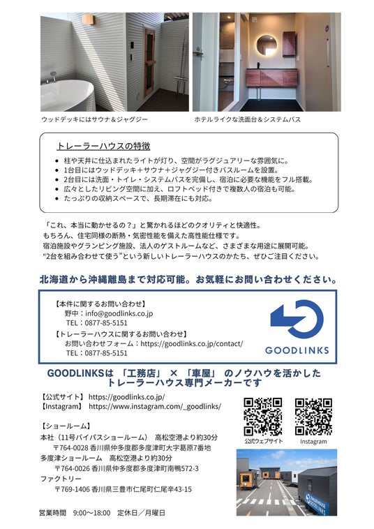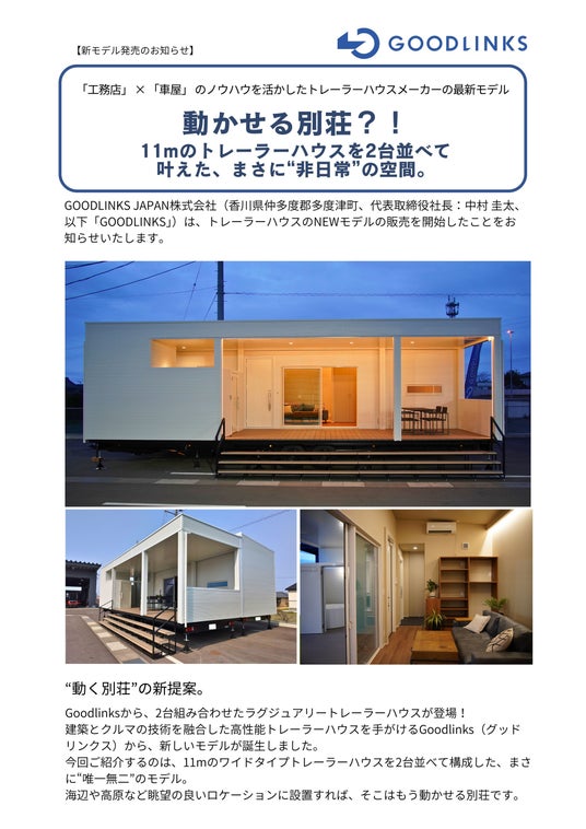 GOODLINKS JAPAN株式会社(香川県仲多度郡多度津町、代表取締役社長:中村 圭太、以下「GOODLINKS」)は、トレーラーハウスのNEWモデルの販売を開始したことをお知らせいたします。
