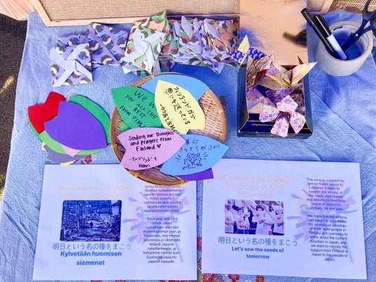 小中学生、OSAO(職業学校)の学生、日本フィンランド協会オウル支局の方々、オウル市に住む日本人、そしてオウル市民の皆さんによるものです。遠くフィンランドからも、多くの方々が能登の復興を応援しています。