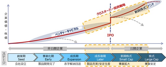 本ファンドは、上場新興企業だけでなく、非上場企業にも投資を行うクロスオーバー投資戦略を採用しております。高成長が見込まれる非上場企業への投資と、株式公開(IPO)後も長期的な株主として関わり続けることで、スタートアップ企業の中長期的な成長を支援してまいります。本ファンドの設定は本格的なクロスオーバー投資戦略の事業化を志向するもので、外国籍投資信託スキームにより、約30%を上限に非上場株式へ投資いたします。また、レイターステージのスタートアップ企業を中心とする厳選投資により、非上場株式投資のリスクを抑制してまいります。