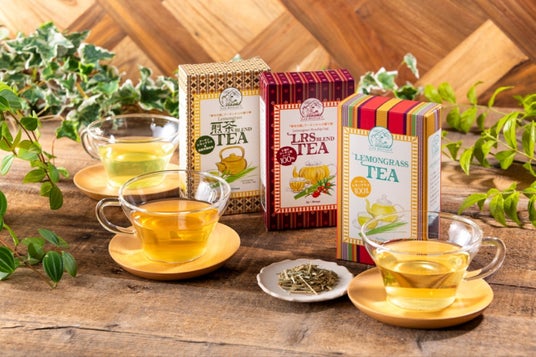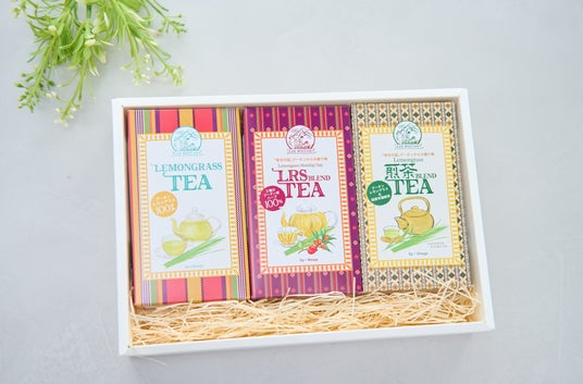 写真右から、レモングラスティー・LRSブレンドティー・煎茶ブレンドティー