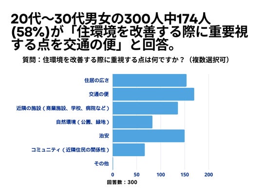20代~30代の男女300人を対象とした「住環境を改善するために特に重視する点は何ですか?」というアンケートで、174人(58%)が「交通の便」という結果になりました。
