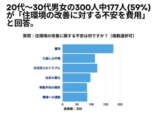 20代~30代の男女300人を対象とした「住環境の改善に関する不安は何ですか?」というアンケートで、177人(59%)が「費用」という結果になりました。