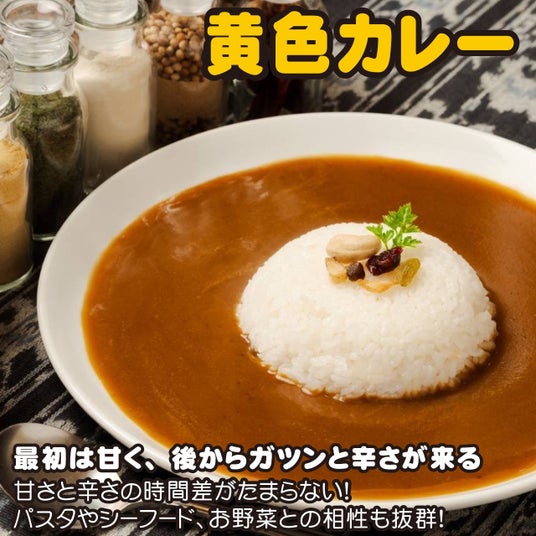 ■黄色カレー最初は甘く、食べすすめていくと後からガツンと辛さがやってくる、この甘さと辛さの時間差の味がたまらない!海の幸(シーフード)との相性が抜群で1度食べたら忘れられないカレーです。