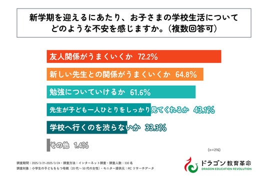 新学期を迎えるにあたって、子どもの学校生活で感じる主な不安は「新しいクラスメイトとの人間関係」や「新しい先生との人間関係」
