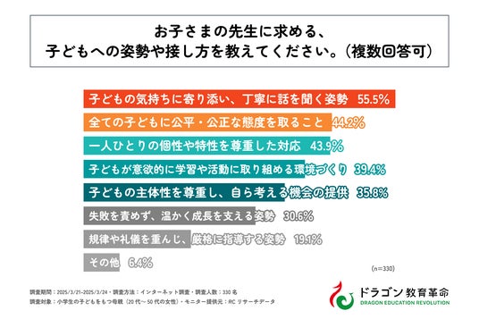 調査の最後、「お子さまの先生に求める、子どもへの姿勢や接し方」を尋ねる設問への回答では、1位が「子どもの気持ちに寄り添い、丁寧に話を聞く姿勢」で55.5%、2位が「全ての子どもに公平・公正な態度を取ること」で44.2%、3位が「一人ひとりの個性や特性を尊重した対応」で43.9%という結果になりました。この結果から、小学生の子を持つ母親が学校の先生に求める子どもへの姿勢や接し方で最も多いものは「子どもの気持ちに寄り添い、丁寧に話を聞く姿勢」であることがわかりました。