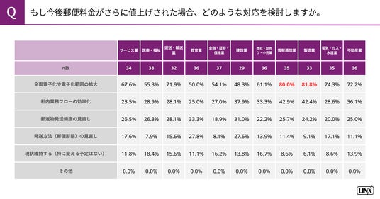 全体として、郵便料金値上げが今後発生した場合に備え、電子化を軸としながらも、業種ごとに実務に即した効率化を検討する動きが広がっていることがわかります。
