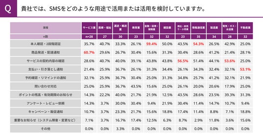 「本人確認・二段階認証」を挙げた割合は、金融・証券・保険業が59.4%、情報通信業が54.3%と高く、セキュリティ関連の用途が目立ちました。「商品発送・配達通知」はサービス業が60.7%で突出しています。
