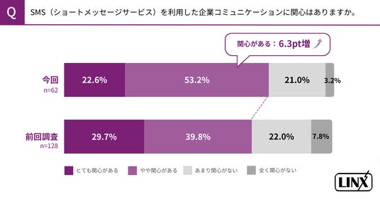 現在SMSを利用していない方に、SMSを利用した企業コミュニケーションに関心があるか尋ねたところ、「とても関心がある」が22.6%「やや関心がある」が53.2%で、合わせて7割以上が関心があると回答しました(n=62/現在SMSを利用していない方)。