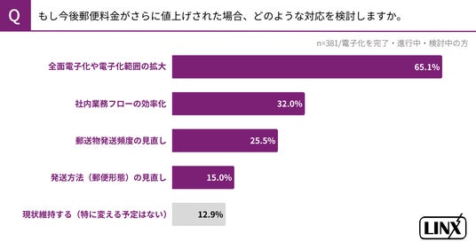 将来的に郵便料金がさらに値上げされた場合の対応について尋ねたところ、65.1%が「全面電子化や電子化範囲の拡大」を検討すると回答し、多くの企業が電子化をさらに推進する意向を示しました(n=381/電子化を完了・進行中・検討中の方)。
