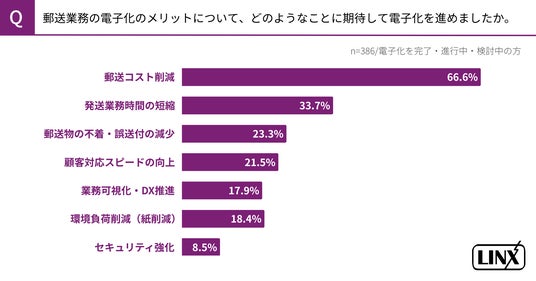 電子化によってどのような効果を期待しているかを尋ねたところ、「郵送コスト削減」が66.6%で最も多く、「発送業務時間の短縮」が33.7%、「郵送物の不着・誤送付の減少」が23.3%と続きました。(n=386/電子化を完了・進行中・検討中の方)。