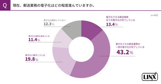 現在の郵送業務の電子化状況を尋ねたところ、「全ての電子化が完了している」が13.4%、「一部の電子化が完了している」が43.2%、「着手している」が19.8%となり、約8割の企業が何らかの形で電子化を進めていることがわかりました(n=440)。