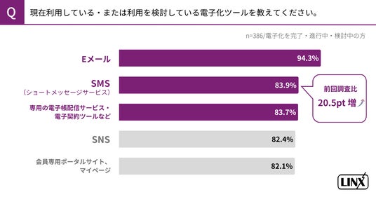 現在利用している、または検討している電子化ツールを尋ねたところ、「Eメール」が94.3%で最も多く、「SMS」が83.9%、「専用の電子帳配信サービス・電子契約ツールなど」が83.7%と続きました(n=386/電子化を完了・進行中・検討中の方)。