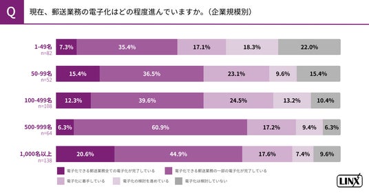 郵送業務の電子化状況を企業規模別に見ると、従業員数が500名以上の企業ほど電子化が進んでいることが明らかになりました。一方で、従業員数が1~49名の企業では「電子化の検討を進めている」が18.3%、「電子化は検討していない」が22.0%と、対応の遅れが見られます(n=440)。