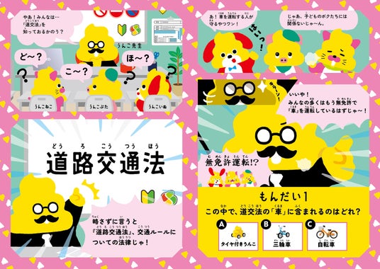 「うんこ先生」がナビゲーターとなり、道路交通法や交通安全のポイントを楽しく説明。