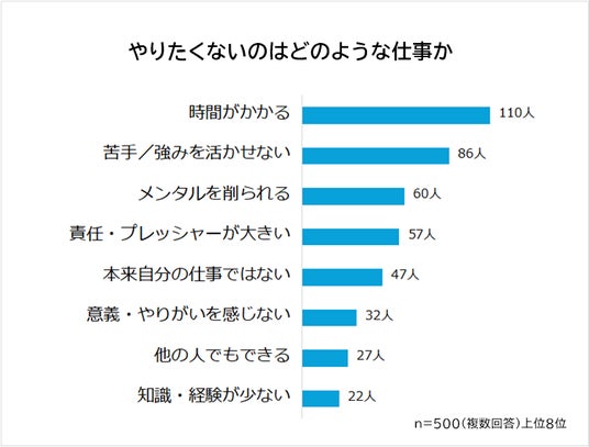 やりたくないと感じる仕事の1位は「時間がかかる(110人)」、2位は「苦手/強みを活かせない(86人)」でした。3位には「メンタルを削られる(60人)が続きます。