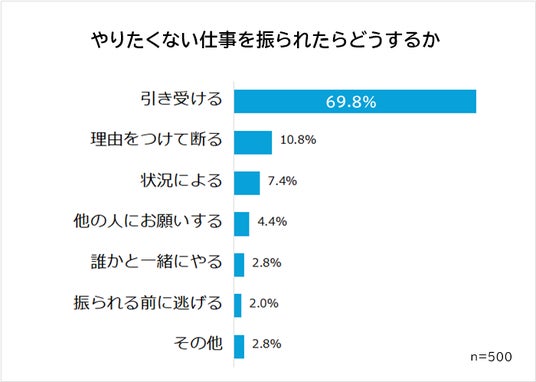 社会人500人に「やりたくない仕事を振られたときにどうするか」を聞いたところ、「引き受ける」と回答した人が約7割にのぼりました。