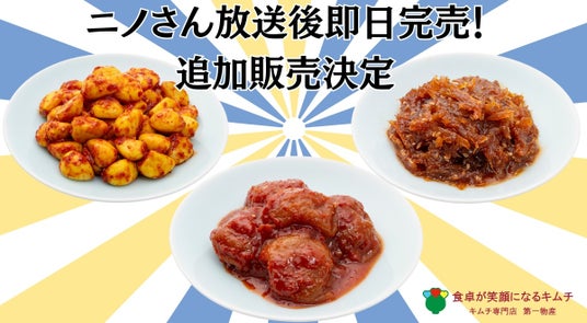 960年創業から代々伝わる伝統製法で作り続けているキムチ専門店 株式会社第一物産(本社:東京都台東区 代表:姜恵蘭)は、第一物産の人気商品である「梅干しキムチ」「カレーニンニクキムチ」「干し鱈キムチ」が、11/15(金)放映の日テレ「ニノさん」2時間SP内で紹介され、即日完売となりました。完売後も、お客様からの「食べたい」とう要望を多く頂戴したため、急遽追加製造を決定し、追加販売することを決定しました。