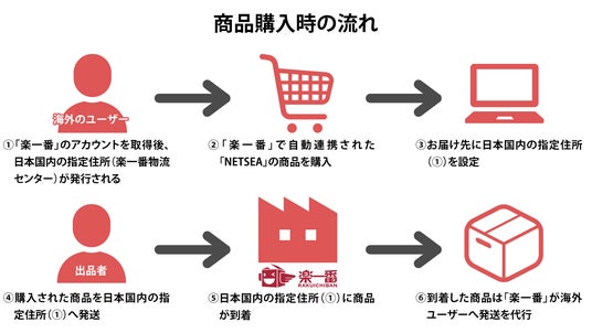 ・商品が指定住所(楽一番物流センター)に到着後、海外への配送を「楽一番」が代行し、海外ユーザー様のもとへ商品をお届けいたします。