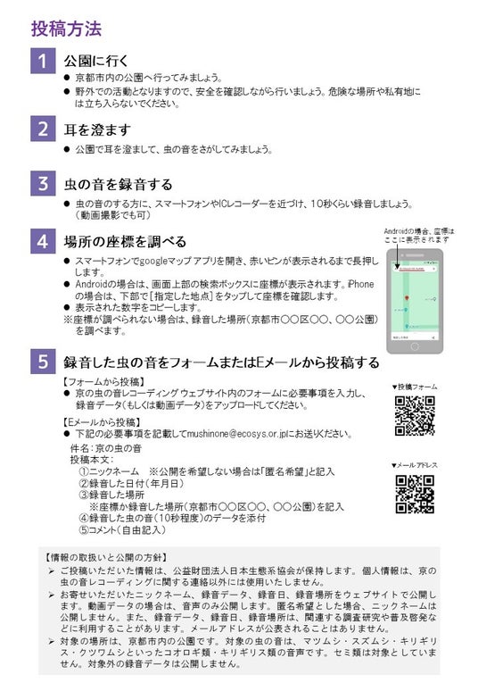 現在でも、私たちの身近な場所に鳴く虫はくらしています。しかし、人々が虫の音を意識しなくなり、風流に楽しむことは減ってきています。秋の夕暮れに、京都市内の公園へ出かけて、虫の音に耳を澄ませ、録音・投稿してみましょう。皆様からお寄せいただいた音声データを、「京の虫の音レコーディング ウェブサイト」に掲載し、共有します。