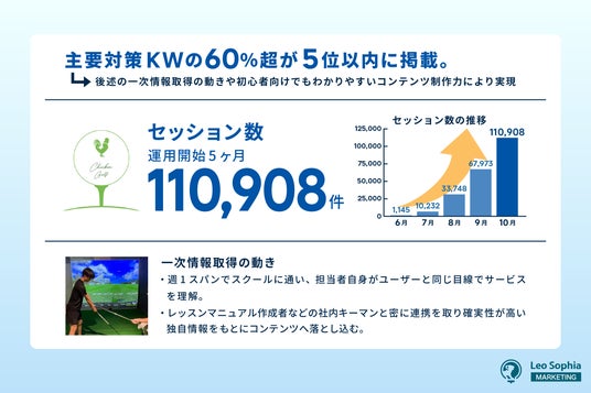 Webマーケティング支援を行っている株式会社Leo Sophia(本社:東京都目黒区、代表取締役:永崎 太一)が運営する「レナップSEO」において、株式会社CHICKEN GYM(本社:東京都渋谷区、代表取締役:山本 康太)の事業である「チキンゴルフ」のオウンドメディア運用の成功事例を公開したことをお知らせします。