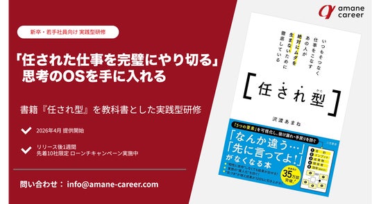 事業開発・地域開発を手がける、あまねキャリア株式会社(代表取締役CEO:沢渡あまね、所在地:静岡県浜松市)は、沢渡あまねの最新刊『任され型』(三笠書房)を教科書とした、新卒・若手社員向けの実践型研修「仕事の組み立て方 基礎研修」を2026年4月より提供開始します。