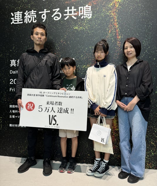 記念すべき5万人目の来場者は、岐阜県にお住まいの西尾さんご家族。大阪訪問の理由は、お父様が真鍋大度氏のファンで本展覧会に参加するためにお越しいただいたそうです。VS.開業後5万人目のお客様である事については「とても光栄なことです、おめでとうございます。」と仰っていただきました。