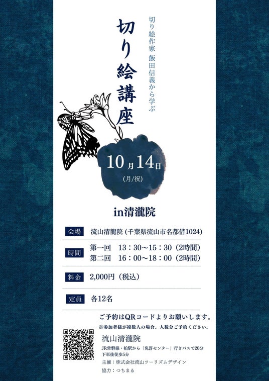 切り絵作家 飯田信義から学ぶ 切り絵講座(主催:株式会社流山ツーリズムデザイン)は、2024年10月14日(月/祝)に流山 瀧櫻 清瀧院で開催します。