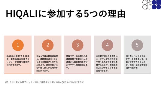 OptQC株式会社(本社:東京都豊島区南池袋、代表取締役:高瀬 寛)は、光量子コンピュータの産業応用を推進するメンバーシッププログラム「HIQALI(ヒカリ、Hub for Innovation in Quantum And Light-driven Industry)」を設立し、参加企業の募集を開始します。また、HIQALI参加企業を対象としたセミナー「光量子コンピュータの実用化戦略と未来展望」を4月24日(木)に開催します。