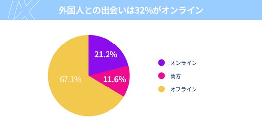 - 72%が外国人との出会い方について「出会い方にはこだわらない(オンラインでもOK)」、もしくは「オンラインでの出会いを希望」と回答