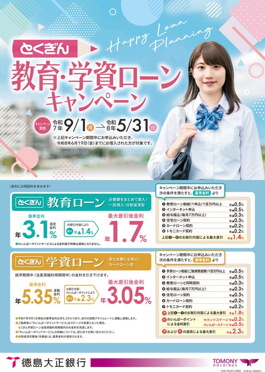 トモニホールディングスグループの徳島大正銀行(徳島県徳島市、頭取:板東 豊彦)では、令和7年9月1日(月)より、「とくぎん教育・学資ローンキャンペーン」を開始しますので、お知らせいたします。