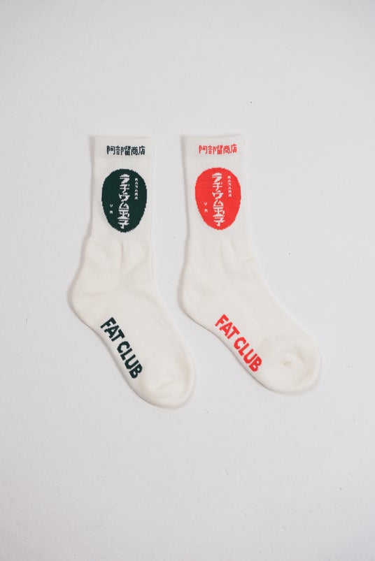 FAT CLUBメンバーも幼い頃から食べている、阿部留商店さんの人気商品の『元祖ラヂウム玉子』を新しい目線で。をテーマに日常に更に溶け込ませる靴下を阿部留商店さんと共に創りました。
